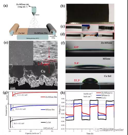 鋰金屬以其高的理論重量容量(3860 mAh g -1)和低電位(-3.04 V vs標(biāo)準(zhǔn)氫電極(SHE))被認(rèn)為是最有前景的鋰基電池陽(yáng)極之一。不幸的是,在重復(fù)鍍剝過(guò)程中,鋰陽(yáng)極普遍存在不可控的枝晶,導(dǎo)致鋰電池循環(huán)壽命短,甚至短路。在這里,單鋅原子固定在MXene (Ti3C2Clx)層(Zn-MXene)有效地誘導(dǎo)Li成核和生長(zhǎng)。在初始鍍階段,由于Zn原子的大量存在,鋰在Zn- mxene層表面趨于均勻成核,然后由于邊緣處強(qiáng)烈的避雷針效應(yīng),沿成核位置垂直生長(zhǎng),形成碗狀鋰,但沒(méi)有鋰枝晶。因此,采用Zn-MXene薄膜作為鋰陽(yáng)極,其過(guò)電位為11.3 mV,循環(huán)壽命長(zhǎng)(1200小時(shí)),深度剝鍍可達(dá)40 mAh cm-2。