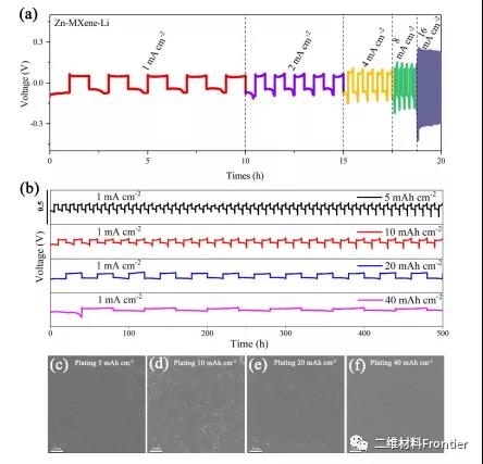 圖 3. a) Zn-MXene-Li 陽(yáng)極在不同電流密度 (1 -16 mA cm -2) 下的倍率能力。b) 不同容量的 Zn-MXene-Li 負(fù)極在 5 -40 mAh cm -2(1 mA cm-2) 范圍內(nèi)的深度剝離和電鍍行為。c) 5 d、10、e)20和f)40mAhcm-2下的Zn-MXene-Li陽(yáng)極的掃描電鏡圖像。