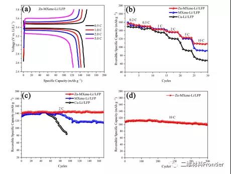 圖4. a) Zn-MXene-Li/LFP 電池在不同倍率 (0.5- 5.0 C) 下的選定放電-充電曲線。b) Zn-MXene-Li//LFP、MXene-Li//LFP 以及 Cu-Li//LFP 電池的倍率能力,即使在 10 C 下也表現(xiàn)出良好的倍率能力。c) Zn-MXene-Li 的循環(huán)性能 //LFP、MXene-Li//LFP 以及 2 C 下的 Cu-Li//LFP 電池。d) Zn-MXeneLi//LFP 電池在 10 C 下的長(zhǎng)循環(huán)性能。(C=170 mA g -1 )