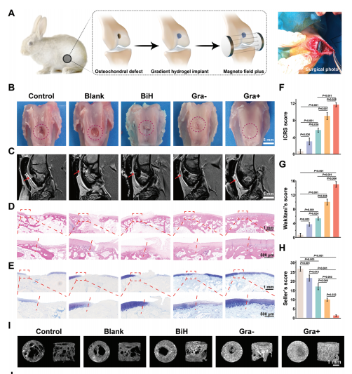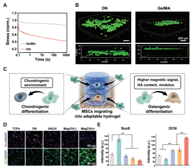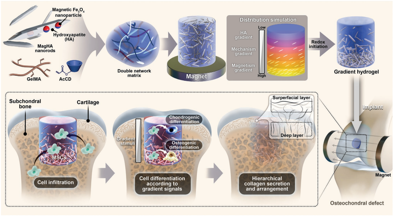 分層骨軟骨缺損的修復需要復雜的梯度重建;然而,很少有連續梯度鑄造的策略考慮到與臨床實際有關的細胞適應性、多個梯度元素和精確的梯度鏡像原生組織。在這里,利用合成的超順磁性HA納米棒(MagHA)開發了一種具有納米羥基磷灰石(HA)、力學和磁性連續梯度的水凝膠,該納米棒易于對磁場做出響應。根據健康兔膝關節的磁共振成像(MRI)計算出優化的精確重建骨軟骨組織梯度模式。然后,MagHA形成連續的生物理化梯度,從而在外部磁刺激下產生增量HA、機械和電磁信號。為了使這種依賴深度的物體起作用,開發了一種適應性強的水凝膠來促進細胞滲透。將該方法應用于兔全層骨軟骨缺損的局部磁場修復,這種多層梯度復合水凝膠以完美的異質特征修復骨軟骨單元,模仿軟骨向軟骨下的逐漸過渡。