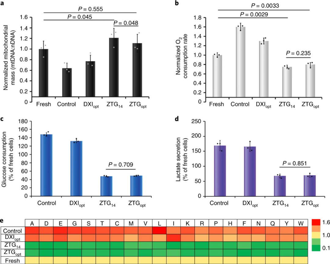 此外,研究人員通過(guò)分析ZTG14,ZTGopt和其他擴(kuò)增方式培養(yǎng)的細(xì)胞內(nèi)線粒體質(zhì)量和代謝活性,發(fā)現(xiàn)ZTG14和ZTGopt細(xì)胞中線粒體質(zhì)量略有增加,與DXIopt和對(duì)照組的顯著下降形成鮮明對(duì)比,另外葡萄糖消耗和乳酸分泌量也遠(yuǎn)低于DXIopt和對(duì)照組。實(shí)驗(yàn)結(jié)果如圖5所示,表明ZTG培養(yǎng)中O2相關(guān)的代謝受抑制,再次證明 ZTG水凝膠3D培養(yǎng)方式保持了原始的HSPC特性。