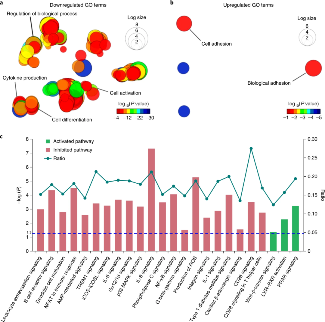 為了更深入地了解ZTG水凝膠內(nèi)的CD34 + HSPC的活性,研究人員利用mRNA深度測(cè)序(RNA-seq)進(jìn)行了基因表達(dá)譜分析。如圖6所示,與新鮮分離的原代HSPC相比,超過(guò)10,000個(gè)基因的表達(dá)在ZTG培養(yǎng)的HSPC中沒(méi)有顯著變化。對(duì)比其他培養(yǎng)方式,ZTG培養(yǎng)組中與細(xì)胞分化,細(xì)胞活化和細(xì)胞因子產(chǎn)生相關(guān)的基因顯著下調(diào),再次表明ZTG培養(yǎng)方式可減緩細(xì)胞代謝過(guò)程。