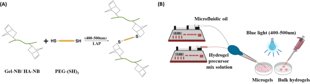 圖4(A)巰基-降冰片烯點擊反應示意圖;(B)塊狀水凝膠和微凝膠制備示意圖