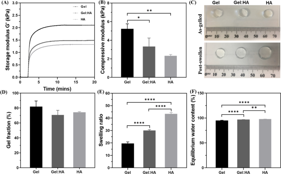 首先,作者設計了三種不同的含有硫醇功能化PEG (PEG-(SH)2)的水凝膠,并與降冰片功能化明膠(Gel-NB)或降冰片功能化透明質酸(HA-NB)或Gel-NB和HA-NB的混合凝膠混合使用。水凝膠的光交聯動力學通過原位光流變學進行監測,結果顯示,無論水凝膠組成如何,光暴露的幾秒鐘內就能迅速形成凝膠。從壓縮測試中得到的應力-應變曲線可知,Gel、Gel:HA和HA水凝膠的壓縮模量分別為5.2、3.3和2.3 kPa,與存儲模量的變化趨勢相同。這些數據表明,水凝膠的硬度呈現出Gel>Gel:HA> HA的趨勢。由于高含水量的水凝膠往往比含水量少的水凝膠更軟,HA和明膠親水性的差異也可能導致由它們形成的水凝膠的力學性能的差異(圖2)。