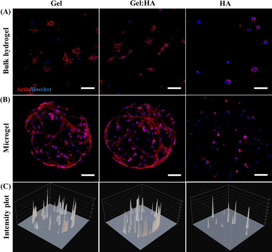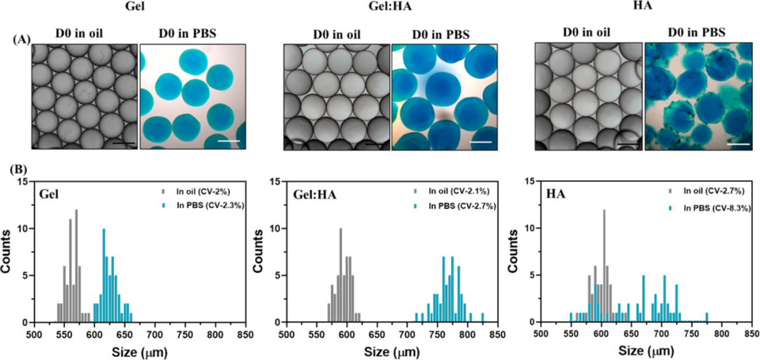 接下來,作者使用基于移液管的微流體技術合成Gel、Gel:HA和HA微凝膠。對微凝膠的大小和分布進行了表征。Gel:HA微凝膠與在塊狀水凝膠中觀察到的溶脹一致,都歸因于HA的高親水性(圖3)。
