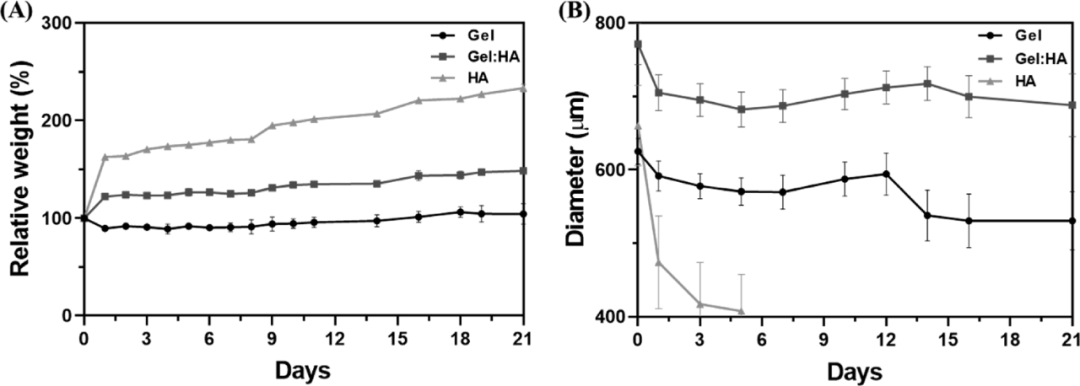 為了了解水凝膠對細胞培養的穩定性和適宜性,作者測定了三種水凝膠制劑在大體積和微凝膠狀態下的體外降解率。與塊狀水凝膠相比,在DPBS中Gel:HA和HA水凝膠的質量顯著增加。所有體積水凝膠的凝膠質量在10天內保持相對穩定。10天后,觀察到所有水凝膠成分的質量逐漸增加,HA 增加的比例更高。同時微凝膠的降解性能與整體水凝膠有顯著差異。微凝膠與塊狀水凝膠的比表面積的增加增加了傳質導致塊狀水凝膠更快的降解,這種效應對于高親水性的HA微凝膠更為明顯,可能是由于較高的溶脹程度(圖4)。
