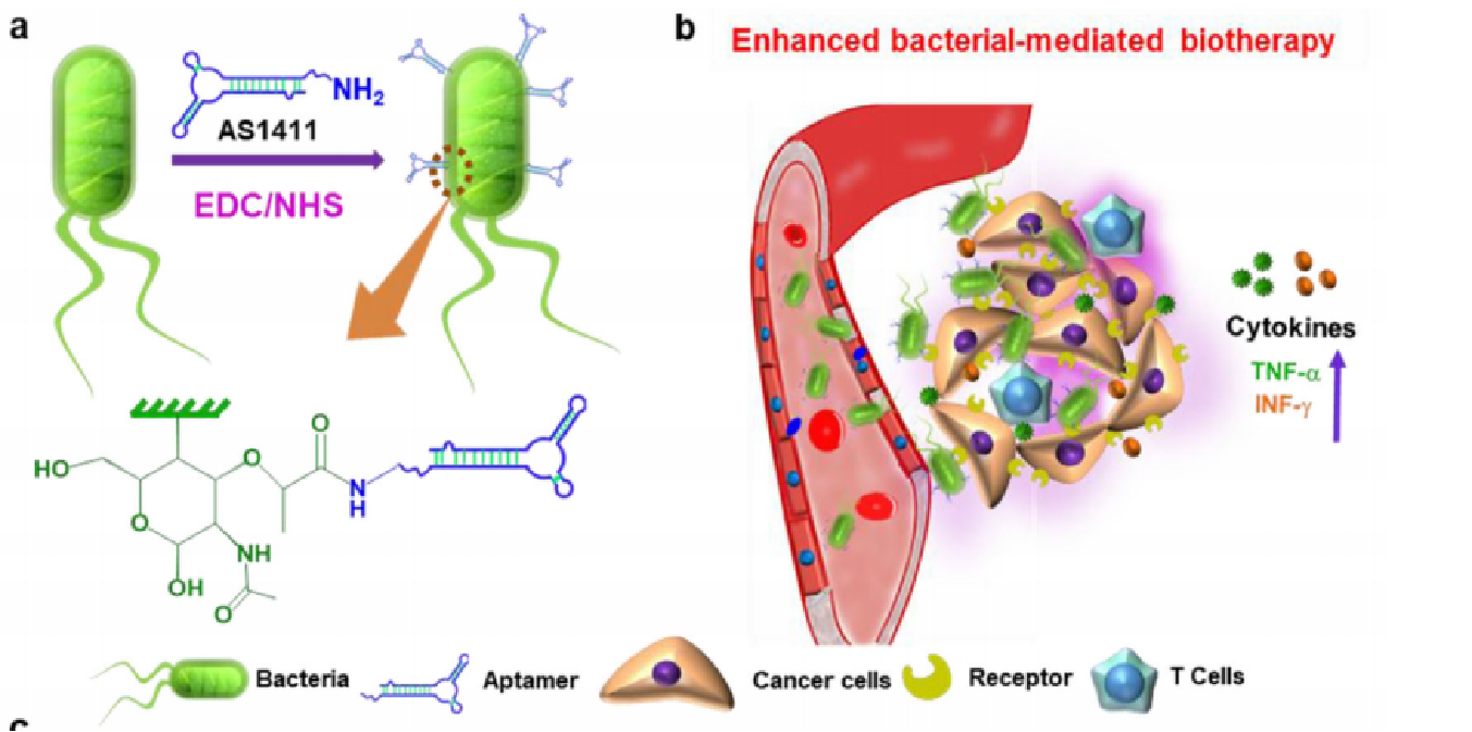 適配體與細菌表面的結合是由一個簡單和細胞相容的酰胺化程序描述的,這可以顯著促進全身給藥后細菌在腫瘤部位的定位。通過改變進料比,可以很容易地調節適配體的表面密度,而偶聯作用可以提高錨定的適配體的穩定性。