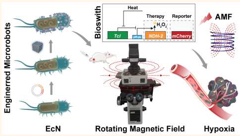 生物雜交微機器人,它集成了磁性、熱性和缺氧敏感性和一種內部熒光蛋白,作為靶向癌癥治療的熱信號和定位信號的雙重報告基因。