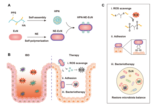 透明質酸-聚(丙烯硫化物)聚合物(HA-PPS),并開發了能夠有效清除ROS的ROS清除納米顆粒(HPN)。為了實現結腸組織靶向效應,將HPN納米顆粒偶聯到修飾的益生桿菌Nissle 1917(EcN)的表面。為了加強對EcN的細菌治療,我們將EcN細胞包裹在多去甲腎上腺素(NE)層中,以保護EcN免受環境攻擊,以提高EcN在口服輸送時的活力,并由于其較強的粘附能力而延長EcN在腸道內的保留時間。