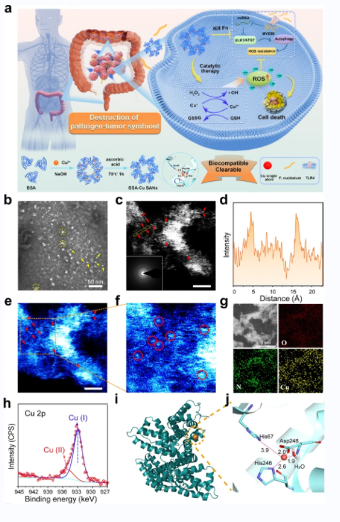 圖一:BSA-Cu SAN的形成和表征。 BSA-Cu SAN的合成及其破壞病原體-腫瘤共生體用于抗腫瘤治療的功能示意圖。