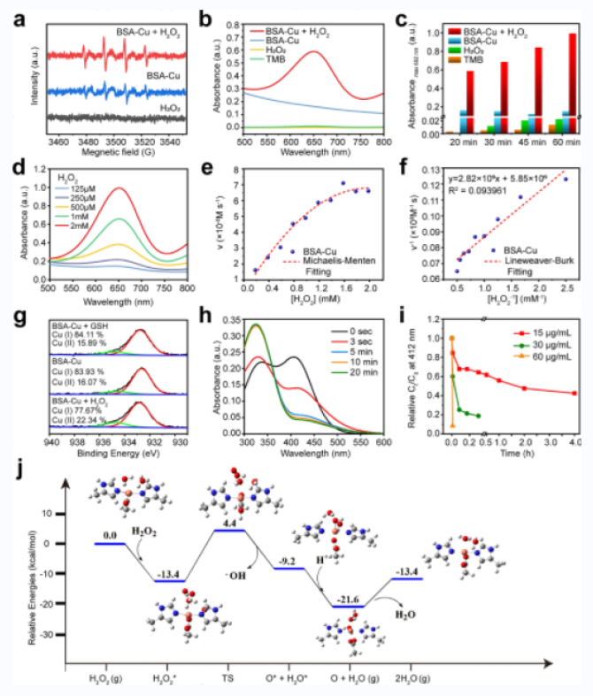 2. 作者設計了一種蛋白支撐的銅單原子催化劑(BSA-Cu SAN),具有過氧化物酶樣活性,可以催化H2O2生成ROS,同時消耗GSH。