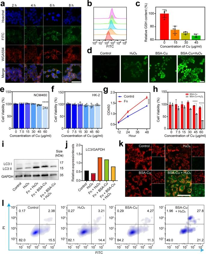 圖四:體外干預 F. nucleatum 誘導的腫瘤增殖與 BSA-Cu SAN 在 HCT116 細胞上。在不同時間與含有116μg/mL銅的BSA-Cu-FITC孵育的HCT45細胞的CLSM圖像。