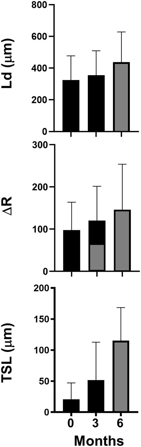 圖3. 第0、3和6個月時病變深度(Ld)、病變深度上的積分反射率(ΔR)和透明表面區厚度(TSL)的測量平均值± SD圖。(TSL厚度僅包括6個月時發生TSL的14處病變)