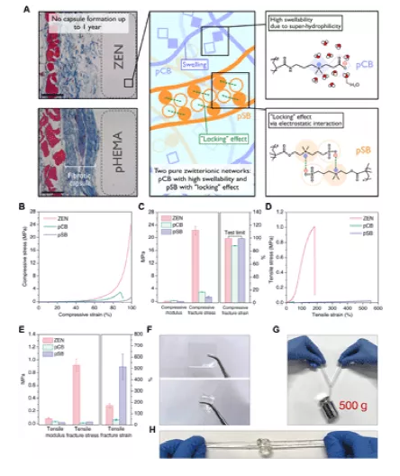 High mechanical strength and long-term resistance to fibrous capsule formation are the two main challenges for implantable materials. Unfortunately, these two different attributes are not fused together, but compromised. Recently, Dianyu Dong of Tianjin University and Caroline Tsao and Professor Hsiang-Chieh Hung of University of Washington collaborated to integrate two weak zwitterionic hydrogels into elastomer-like high-strength pure zwitterionic water through "swelling" and "locking" mechanisms. Gel, thus reporting unique material categories. The related paper titled High-strength and fibrous capsule–resistant zwitterionic elastomers was published in Science Advances. These zwitterionic-elastomeric-networking (ZEN) hydrogels further show that they can effectively resist the formation of fibrous capsules after being implanted in mice for up to 1 year. This material with high mechanical properties and long-term fiber capsule resistance has never been available before. This work not only proves a class of durable and fiber-resistant capsule materials, but also provides design principles for zwitterionic elastomer hydrogels.