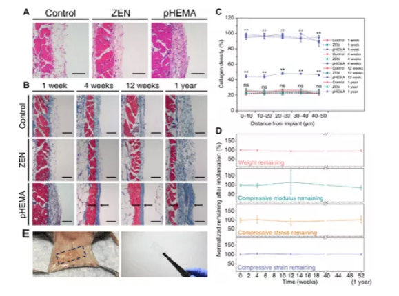 In contrast, after 1 week, almost no cells were observed at the interface between the tissue and the implanted pCB/pSB ZEN hydrogel (Figure 4A), similar to the negative control, indicating that they caused little or no acute inflammation . Derived from excellent anti-fouling performance. During the entire process of this study, the skin tissue adjacent to the pCB/pSB ZEN hydrogel did not show signs of inflammation, nor did it show any dense fibrous capsule formation, but a loose subcutaneous structure similar to the negative control skin tissue (Figure 4, B and C). In addition, the pCB/pSB ZEN hydrogel sample maintained its shape and was highly durable after being implanted for a full year without significant degradation and loss of mechanical properties (Figure 4, D and E). This indicates that ZEN hydrogel materials can maintain long-term fiber capsule resistance and durability in the body.