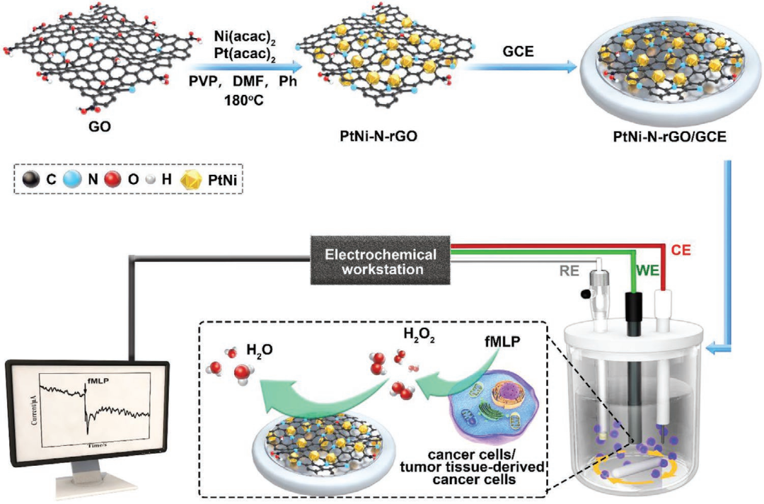 The diagnosis of malignant tumors is very important for clinical treatment selection decisions. Current imaging and pathological diagnosis methods often cannot provide important quantitative molecular information in tumors. The tumor microenvironment has been proven to contain hydrogen peroxide (H2O2). In view of this, Professor Qian Zhiyong of Sichuan University proposed a biosensitive and efficient H2O2 electrochemical sensor based on PtNi nanoparticles and nitrogen-doped reduced graphene oxide (PtNi-N-GO), which has a low detection limit ( 2.8×10-9 M), fast response time (<6 s) and good anti-interference performance.
