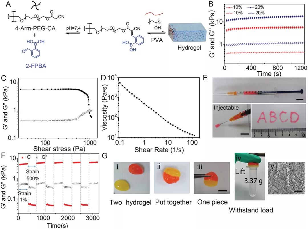 Figure 2. Preparation and characterization of injectable self-healing hydrogels by 2-FPBA-mediated three-component condensation. A) Hydrogel formed by 4-arm PEG-CA, PVA and 2-FPBA. B) Storage modulus (Gʹ) and loss modulus (Gʺ) of 2-FBC hydrogel at different concentrations at 37°C. C) Shear of 10% 2-FBC hydrogel at 37°C Shear stress scanning test. D) Viscosity of 10% 2-FBC hydrogel. E) 10% 2-FBC hydrogel injectability. F) Evaluate 10% at room temperature with alternating strains of 1% and 500% 2 -Self-healing ability of FBC hydrogel. G) 2-FBC hydrogel self-healing process.