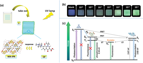 The thin films based on luminescent hydrogen bonded organic frameworks (Hof) have become one of the most excellent materials in optical applications. Therefore, it is very important to develop simple synthesis methods and establish multifunctional applications of Hof based luminescent materials. Recently, the team of Professor Yan Bing of Tongji University has successfully prepared a double emission Eu3+ functionalized HOF hydrogel film (1). When the UV lamp is turned off, it emits blue-green long afterglow with a long afterglow life of 1.99 s. The detection of ofloxacin and flemequine was in accordance with the mode of chroma and ratio.