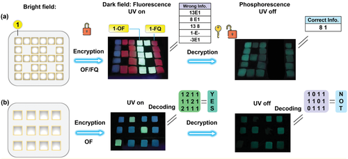 Fig. 5a) thin film anti-counterfeiting array based on 1 and 1-Of, showing the "8" and "6" encryption and decryption process. b) The film anti-counterfeiting array based on 1 and 1-Of shows the process of "yes" and "not" encryption, decryption and decoding.