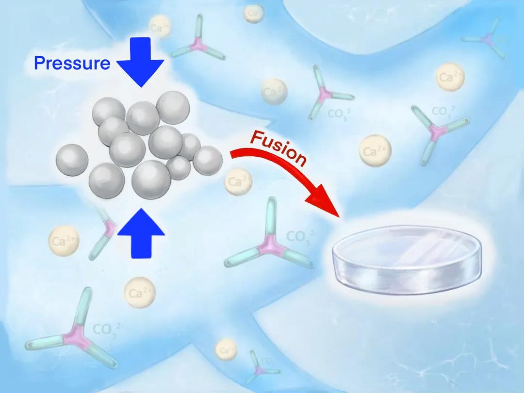 The previous achievement of Tang Ruikang s team - inorganic ion polymerization can realize the rapid preparation of centimeter sized calcium carbonate crystal materials in the laboratory, and the preparation process of these calcium carbonate has strong plasticity, which can grow into various shapes according to the mold shape just like plastic, The study was published in the top international journal Nature in October 2019“ The research in 2019 is to synthesize calcium carbonate crystal bulk materials from scratch. Our work is to study how to turn the existing calcium carbonate powder materials into bulk materials, such as fusing several stones into a big stone. It can be said that the two tasks come to the same end by different routes. Tang Ruikang said. It is in the research process of the previous work that Mu Zhao found an interesting phenomenon that the boundary of amorphous calcium carbonate particles gradually disappeared during the pressing process, and finally completely fused into one. At that time, Mu Zhao did not understand the reasons behind the phenomenon, but Tang Ruikang encouraged Mu Zhao to continue to dig deeper and ask more why. It turns out that water molecules play an important role in the crystallization of amorphous calcium carbonate particles. Although scientists have noticed this phenomenon before, there is still a lack of in-depth study on the relationship between the function, fluidity and structural stability of structural water. Mu Zhaohe and Kong kangren further found that if the water molecules can be kept at a suitable amount, a dynamic water channel can be formed in calcium carbonate, thus promoting the internal material transport process and eventually leading to the fusion of amorphous particles“ Too much water will form a new kind of water cluster, leading to the crystallization of amorphous calcium carbonate particles When one calcium carbonate molecule corresponds to 0.2-1.1 water molecule, and then 0.6-3.0 GPA pressure is applied, the fusion of amorphous calcium carbonate particles under pressure can be realized. The team has successfully constructed calcium carbonate bulk materials with continuous structure. In order to verify the results, the team labeled the gold nanoparticles on the surface of calcium carbonate particles. After extrusion, it was observed by high-resolution transmission electron microscope that there was no interface or gap between the calcium carbonate particles, and it was indeed completely fused“ Stone is rigid, and water is flexible. When there is a proper amount of structural water in the stone, the stone is like plasticine under pressure. When it is extruded, it will fuse and reach the state of you have me, I have you. Liu Zhaoming said.