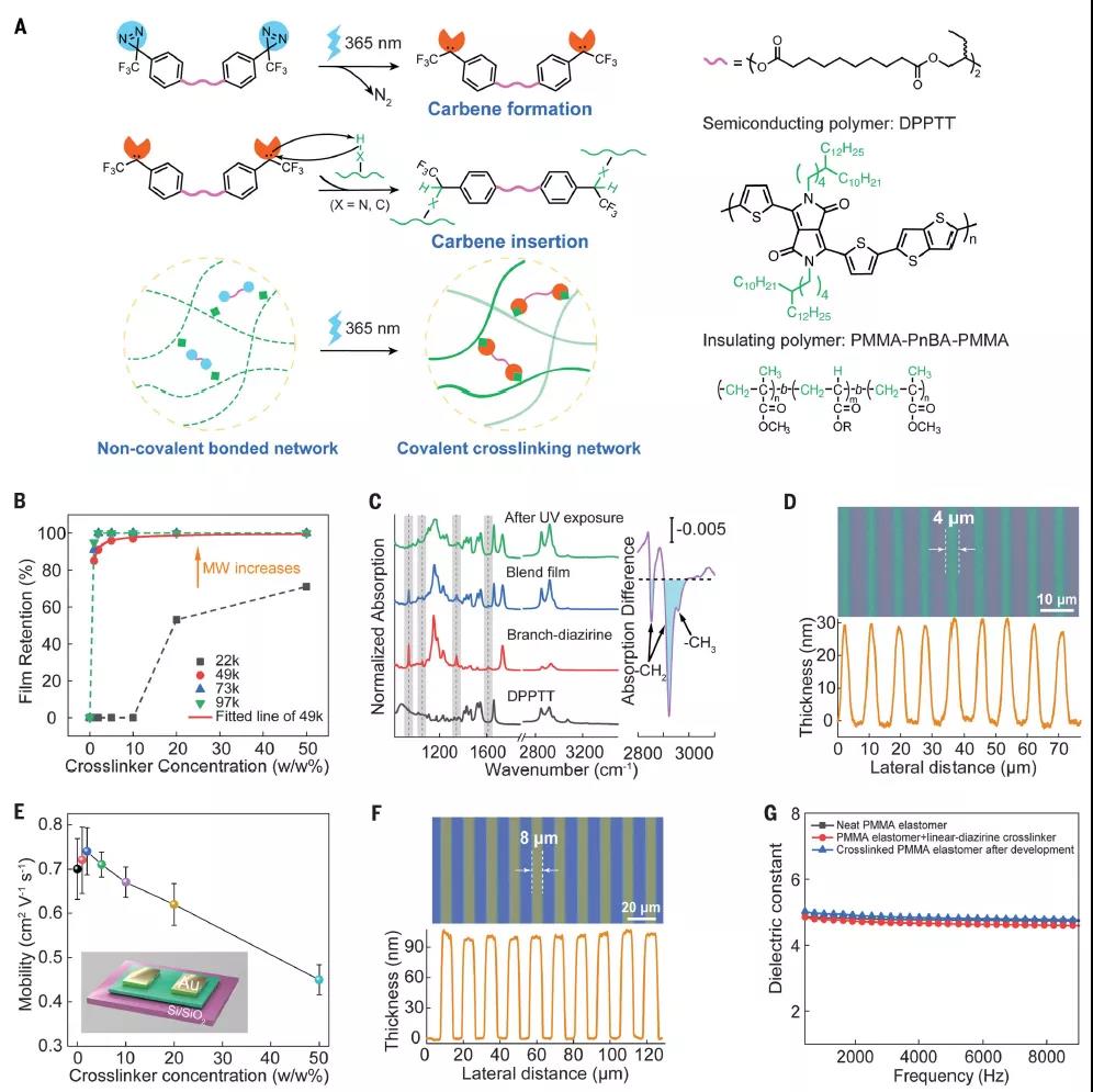 An efficient photoinitiated carbene insertion reaction was used as a general crosslinking method for semiconductor and insulating polymers (Fig. 1E). In addition, polyethylene glycol acrylate (pegdma), which is sensitive to ultraviolet light, is introduced to realize the double network mediated direct photolithography (no chemical modification) of conductive polymer. The device can be manufactured in four direct lithography steps without additional protection, etching, transfer or lamination processes (Figure 1F). The cross-linking based patterning strategy makes each layer stable and chemically resistant, allowing wafer scale layer by layer deposition.