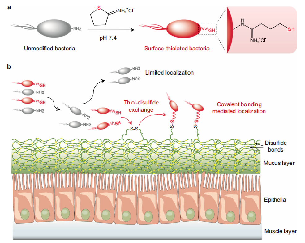 A strategy for the covalent localization of bacteria mediated by in situ chemical reactions. With a simple one-step amidite ester reaction, the primary amino group on the bacterial surface can be converted to free thiols under cytocompatibility conditions. Surface thiolation is suitable to modifying different strains, and the amount of thiols introduced by each bacterium can be easily adjusted by different feed ratios. These chemically reactive bacteria are able to spontaneously bind to the mucus layer by catalyst-free thiol-disulfide exchange between mucin-associated disulfides and newly transformed thiols on the bacterial surface and exhibit sulf-level-dependent attachment.